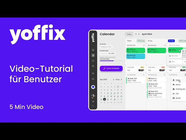 Dieser Leitfaden erklärt, wie du deine Woche in Yoffix planst, deine Anwesenheit verwaltest und Arbeitsplätze, Besprechungsräume und zusätzliche Ressourcen buchst.