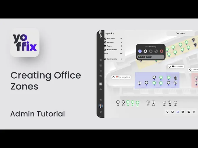 Les administrateurs Yoffix peuvent organiser leurs étages de bureau en zones avec des noms, des couleurs et des tags (attributs) distincts, optimisant ainsi l'utilisation de l'espace et la dynamique d'équipe. Les zones peuvent être réservées à des équipes spéciales ou être marquées comme non disponibles pour la réservation, offrant un contrôle incomparable sur l'allocation de l'espace de bureau.