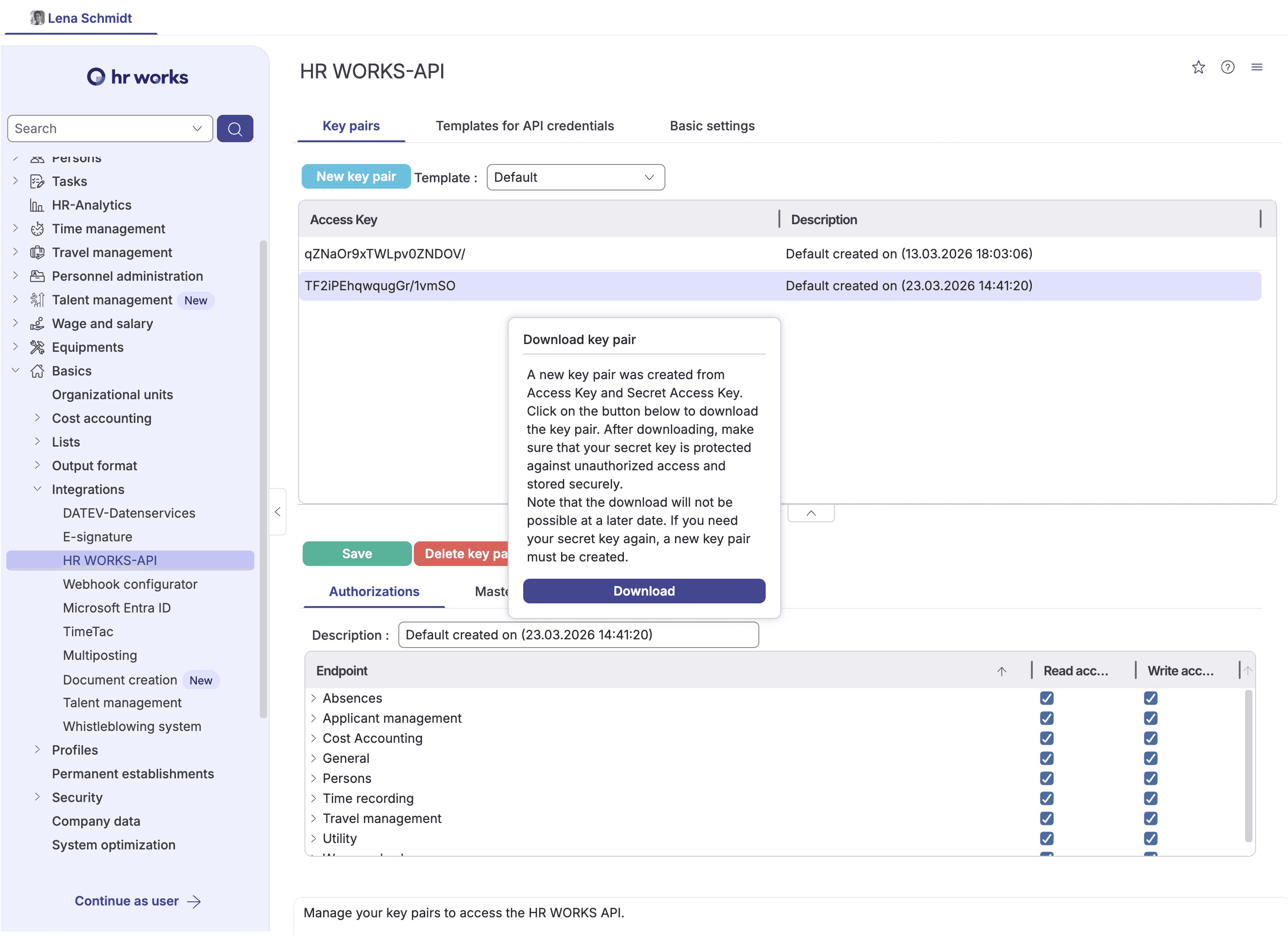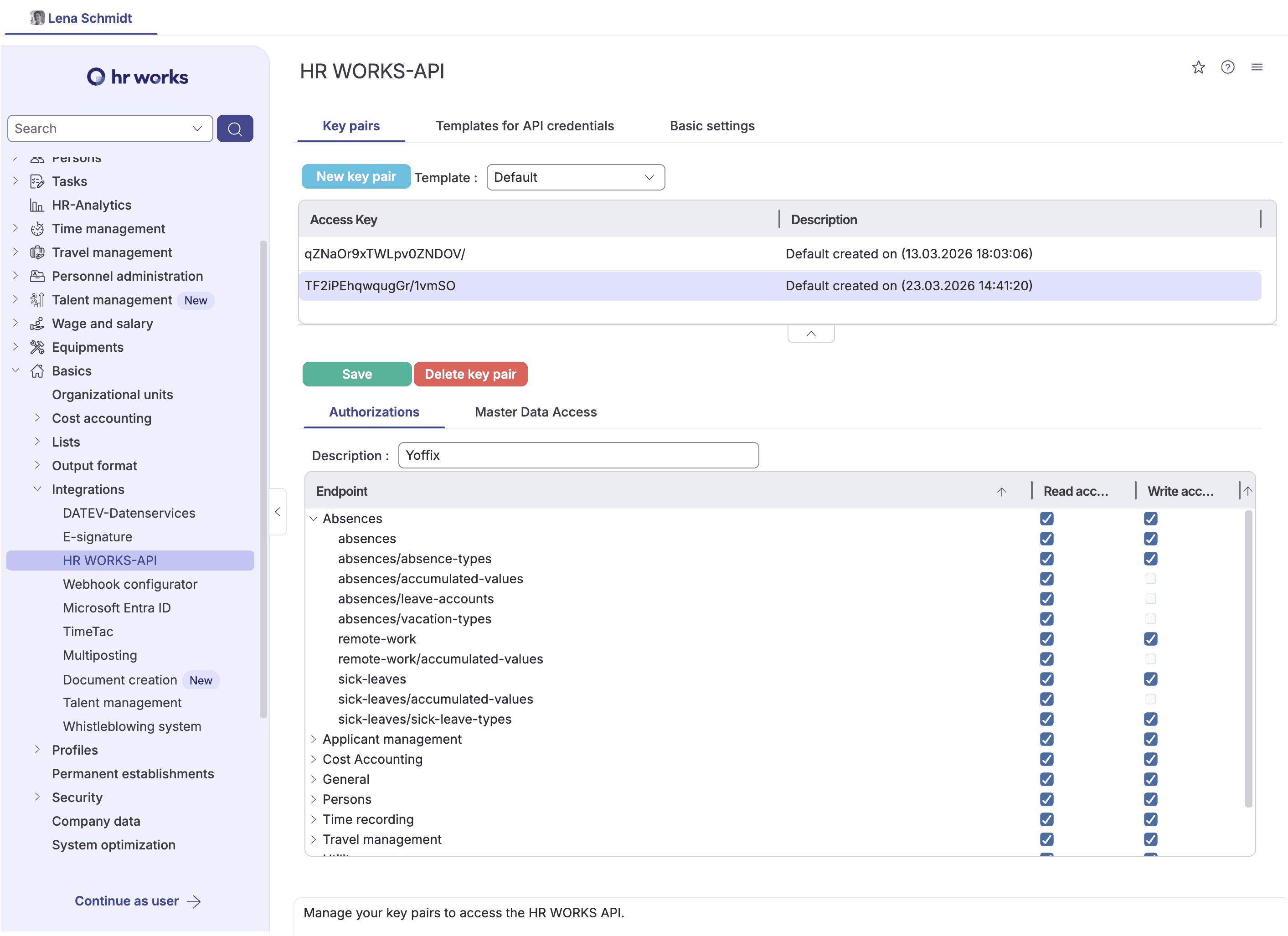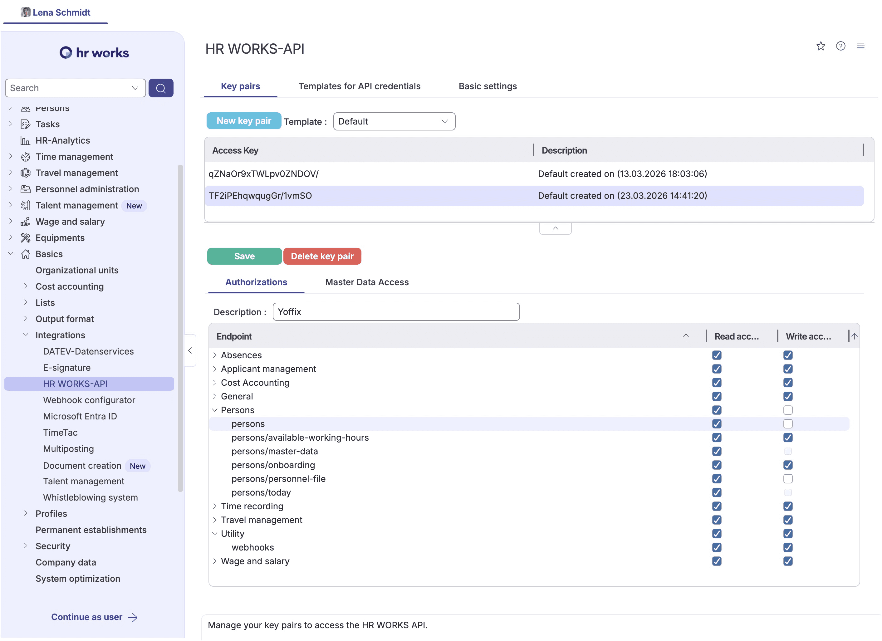 Le fichier d’identifiants a été perdu après le téléchargement La paire de clés ne peut être téléchargée qu’une seule fois. Retournez dans Bases → Intégrations → HR Works API dans HRworks, supprimez la paire de clés existante, créez-en une nouvelle, puis mettez à jour les identifiants dans Yoffix.