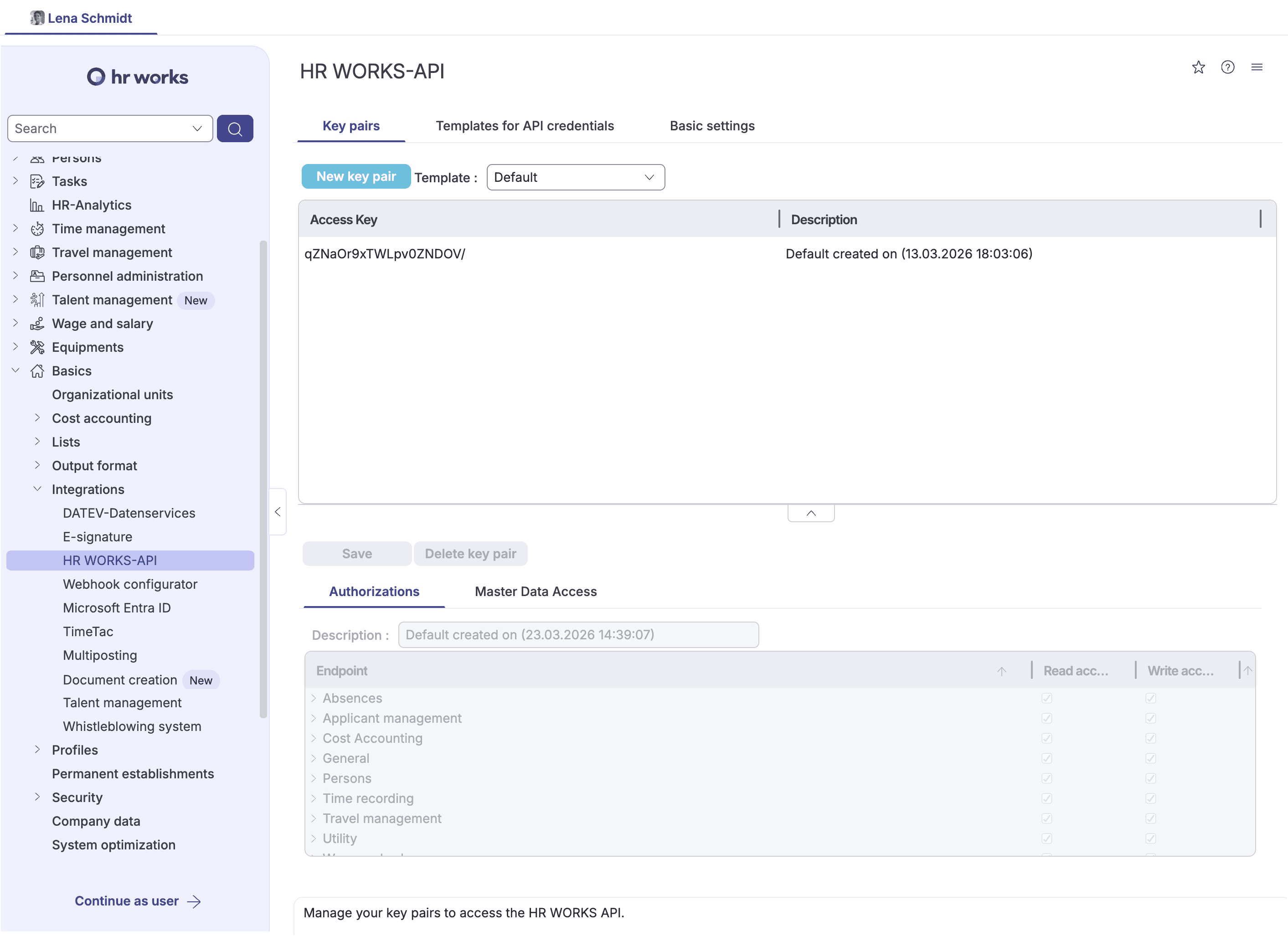 Dans votre compte HRworks, allez dans Bases → Intégrations → HR Works API dans le menu de gauche.