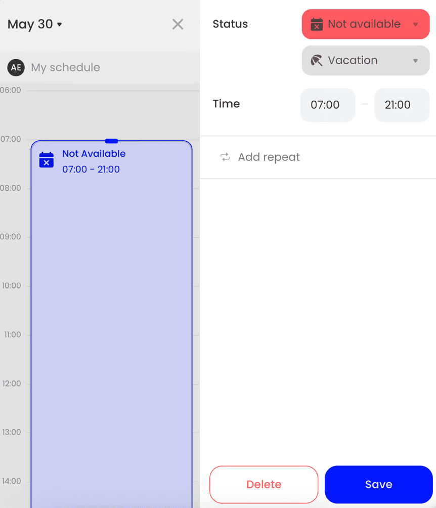 Vous pouvez maintenant ajouter des statuts comme Vacances, Voyage d'affaires, ou Congé Maladie à votre calendrier sans aucune limite de temps – même si c'est plus de deux semaines à l’avance.