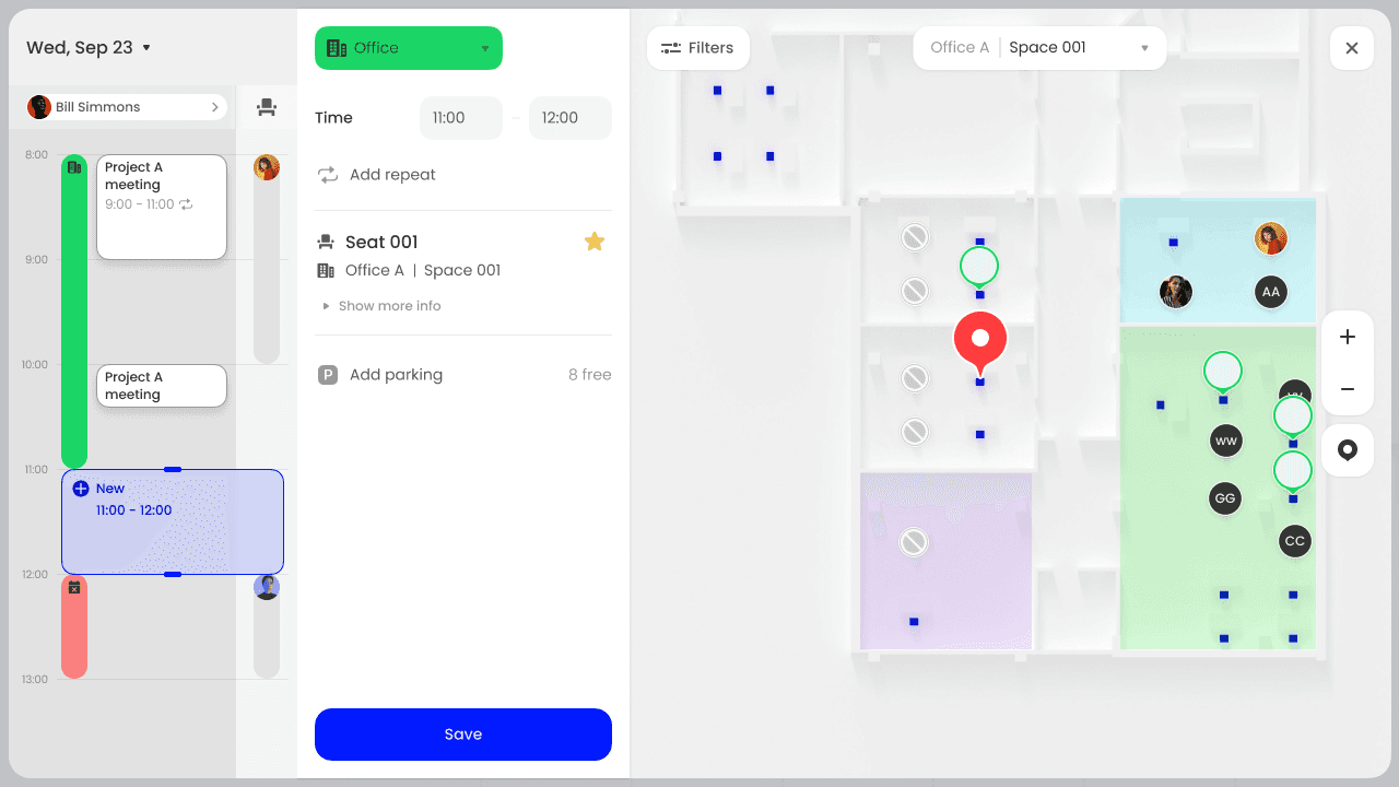 Réservation d'un bureau, d'une salle de réunion ou d'un événement calendrier ? Tout se passe désormais dans la même interface cohérente à travers toute l'application — peu importe où vous êtes.