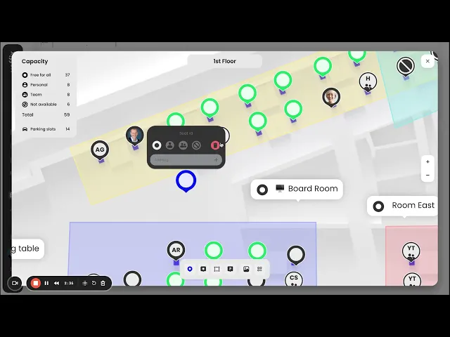 Avec Yoffix, vous pouvez facilement ajouter, modifier et supprimer des espaces de travail et des salles dans votre bureau. Vous pouvez également attribuer des bureaux à des employés uniques ou à des départements, les bloquer, ou les rendre flexibles. Les salles de réunion peuvent être attribuées à des département(s) spécifiques.