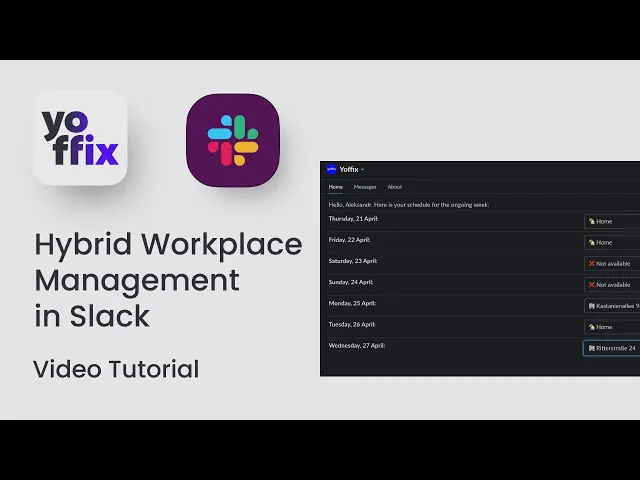 Vous pouvez définir un statut et réserver un bureau sur Slack en quelques clics. Sélectionnez simplement Yoffix sous Applications dans la barre latérale à gauche, et choisissez un statut. Vous verrez la liste des bureaux disponibles parmi lesquels choisir.