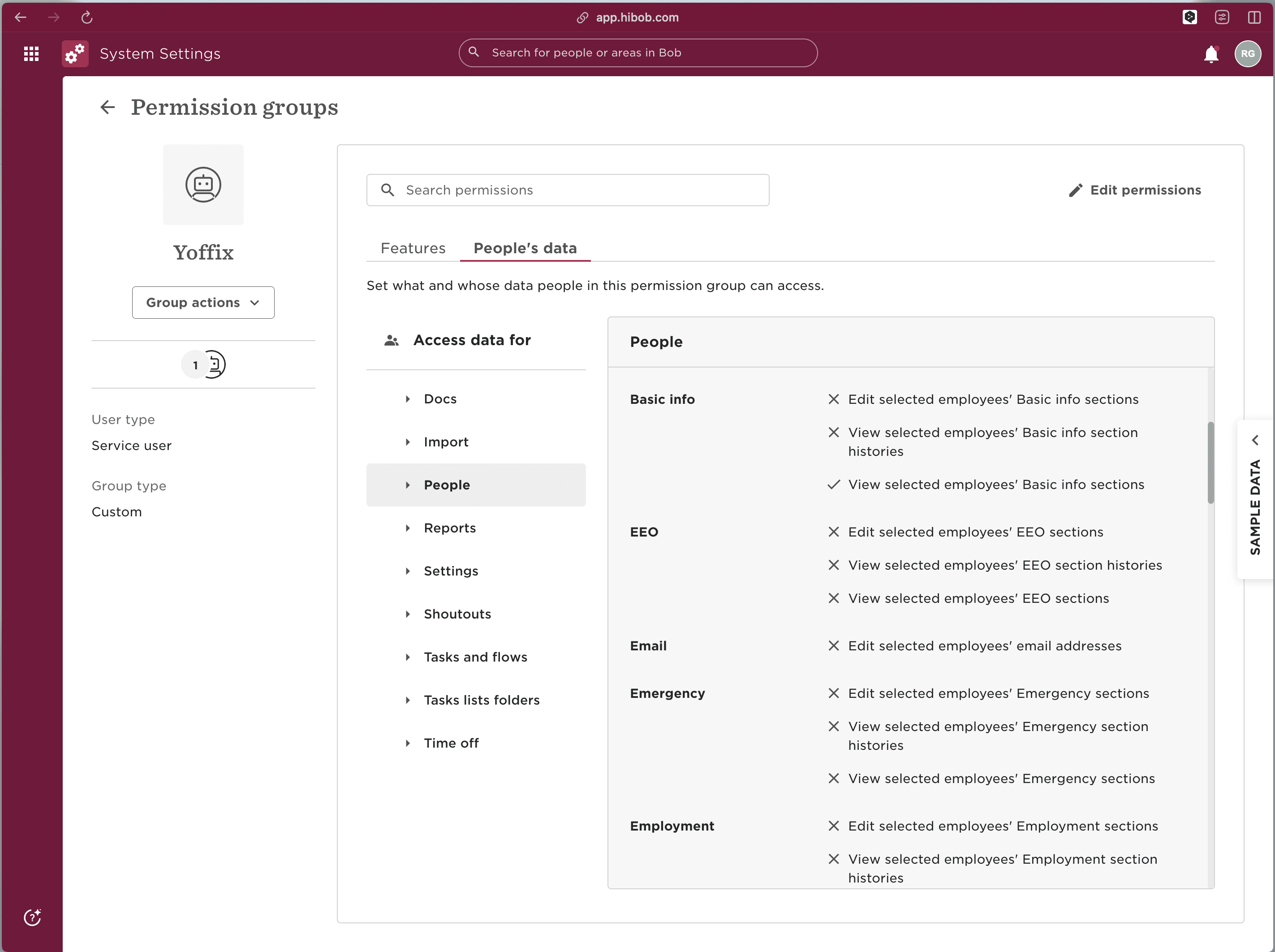 Employee population: In the permission group, open the employee data access settings and choose which employees should be included. For a full company sync, allow access to all employees. If inactive or terminated employees should be processed, make sure the access rule is not limited to currently employed users only.