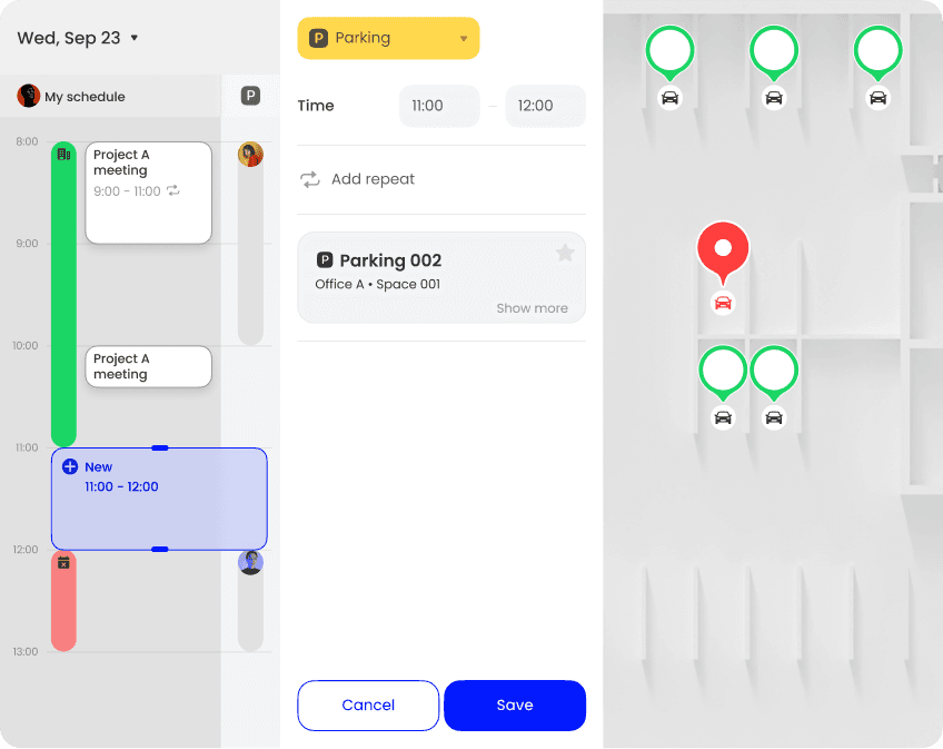 Book parking from the calendar or floor plan and receive instant confirmation.